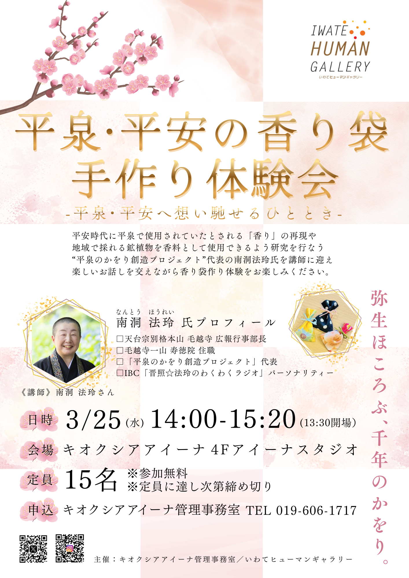 いわてヒューマンギャラリーワークショップ「平泉・平安の香り袋 手作り体験会-平泉・平安に思いを馳せるひととき-」(2/8掲載)