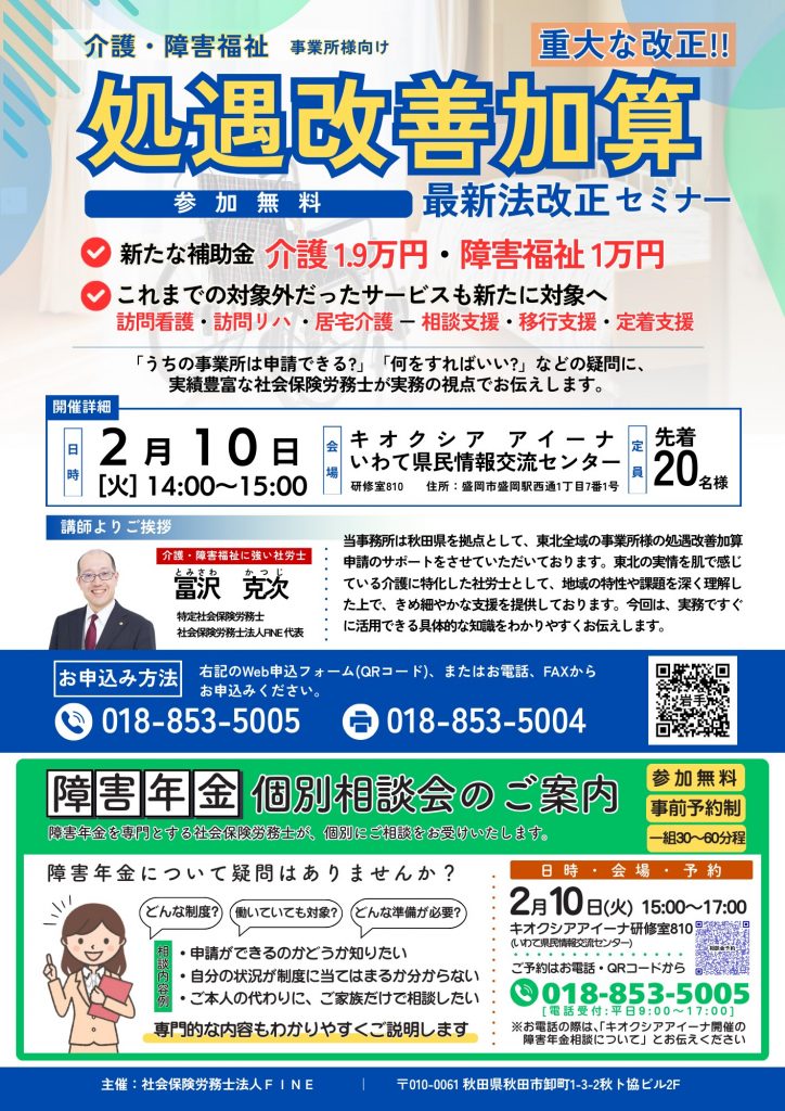処遇改善加算 最新法改正セミナー/障害年金個別相談会(1/9掲載)
