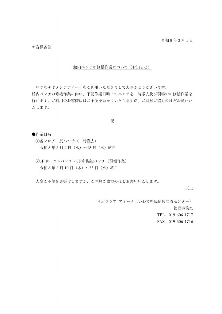 【お知らせ】館内ベンチの修繕作業について